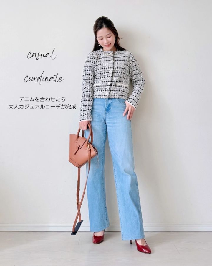 オケージョンスタイルに大活躍なニットショートジャケットですが、デイリーコーデやお出かけコーデにも使えます!こんなふうにデニムコーデに合わせるのもアリですよ♡淡いカラーのデニムなら、爽やかな春スタイルが完成します。キレイめバッグや真っ赤なパンプスで女っぽさを添えて楽しんでみて!