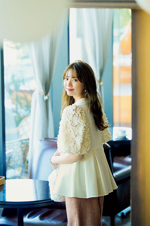 腕肩周りを華奢に見せてくれるグラマラスな袖が着こなしの主役。上半身にボリュームがあるぶん、ボトムはタイトデザインを選んでメリハリを。