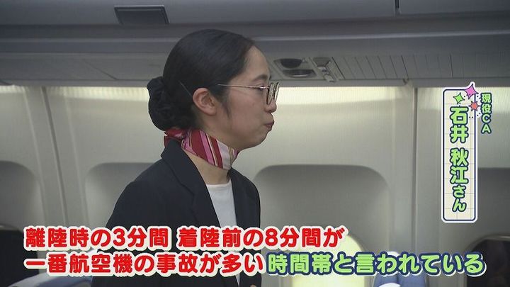 現役CA 石井さん:「“クリティカルイレブンミニッツ”っていう言葉聞いたことあるね?離陸時の3分間、着陸前の8分間が一番航空機の事故が多い時間帯といわれている」