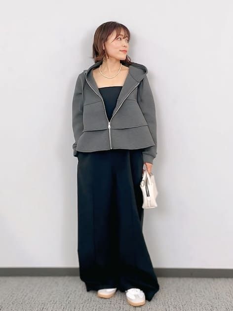 フリルデザインのパーカーで女性らしさをプラス。柔らか素材のパーカーがリラックス感ときちんと見えを両立します。オールインワンのシンプルなシルエットと絶妙にマッチして洗練された雰囲気に。甘さとカジュアルのバランスが絶妙な春らしいコーデです。