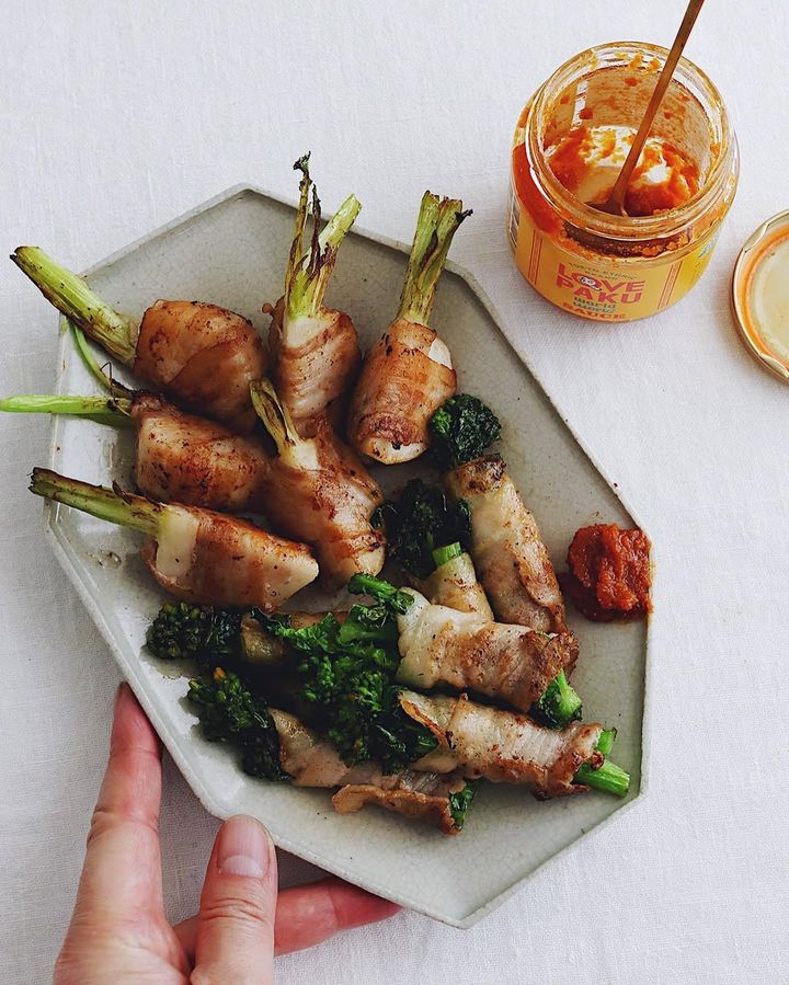 皮をむいてくし形切りにしたかぶと食べやすい長さにカットした菜の花に、薄切りの豚バラ肉を巻きつけて。