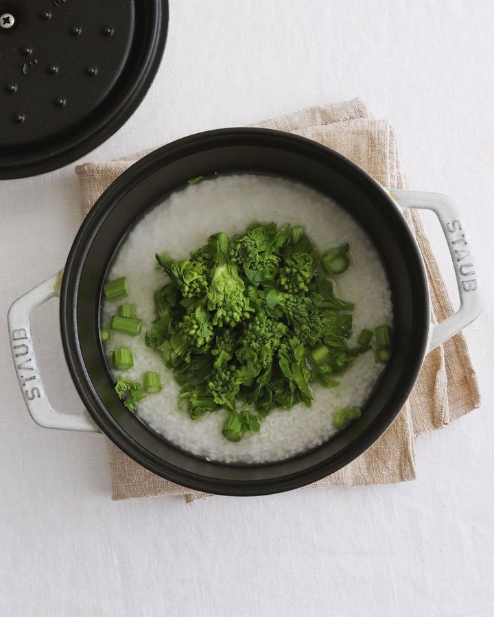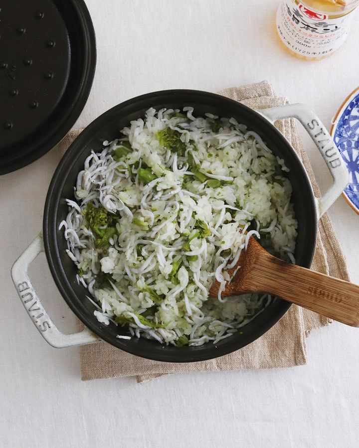 米の上に菜の花をのせて、昆布だしを適量注ぎ、STAUB(ストウブ)で炊き上げて。