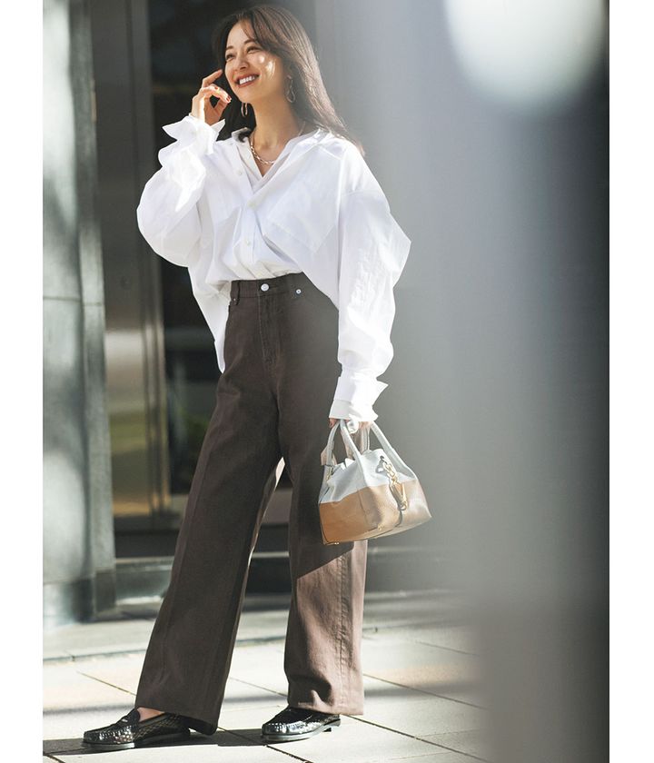シャツを2枚重ねることで胸元に奥行きが出て、強めのアクセと好バランスに。デニムパンツ¥10,450(Mila Owen/Mila Owen ルミネ新宿2店)シャツ¥30,800中に着たシアーシャツ¥28,600(ともにカオス/カオス丸の内)バッグ¥762,300ローファー¥168,300(ともにトッズ/トッズ・ジャパン)ピアス¥27,500ネックレス¥74,800(ともにブランイリス/ブランイリス トーキョー)リング¥44,000(バルブス/ズットホリック)