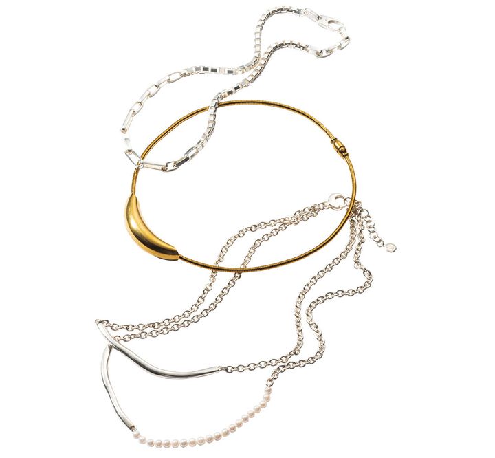 (上から)使いやすいチェーンネックレス。※着用と同じ ネックレス¥68,200(ブランイリス/ブランイリス トーキョー)ゴールドのチョーカーでエレガントに。ネックレス¥3,900(soie/ロードス)1本で重ねづけ風に見える。ネックレス¥101,200(ブランイリス/ブランイリス トーキョー)