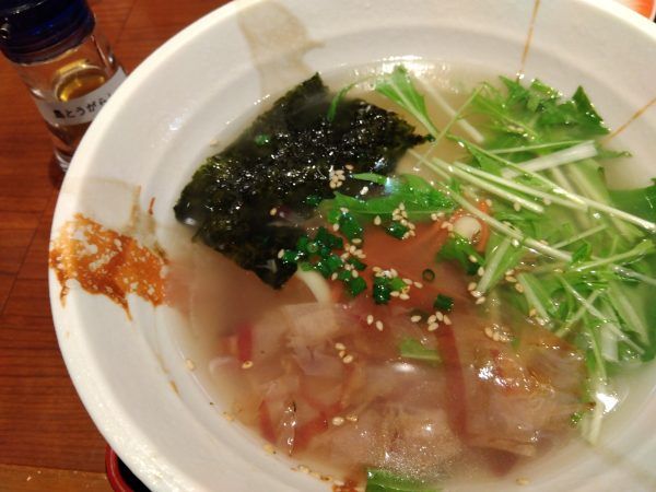 限定30食なのは、沖縄そばに沖縄から直送の生麺を使用しているからなんですよ。豚スープとかつおだしがたっぷりでオイシイ~。もちろんスープはすべて飲み干しましたよ。ピリリと辛い、島とうがらし(コーレーグース)を味変に楽しむのもいいですよ。