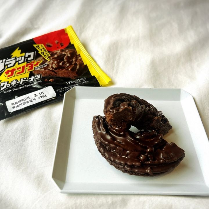 新作「ブラックサンダークッキードーナツ」は、ザクザク触感のクッキードーナツ。クセになりそうなザクザク感は、一度ぜひ試してほしいほど!たっぷりとチョコがコーティングされており、満足度もバツグン!なお、こちらの商品はデザートコーナーではなく、パンコーナーにありますよ!