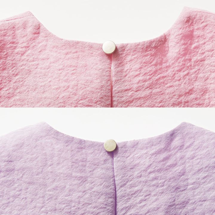 首元が出すぎないよう調整された衿ぐり。袖の始まりを少し内側に入れたことで、ふんわりシルエットでも胴は細く、スッキリと見える身幅に仕上げました。