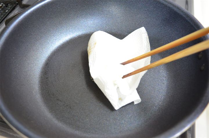 3.フライパンをキッチンペーパーで拭いてソース用のオリーブオイルを入れ、クミンシードを入れて弱火で加熱する。