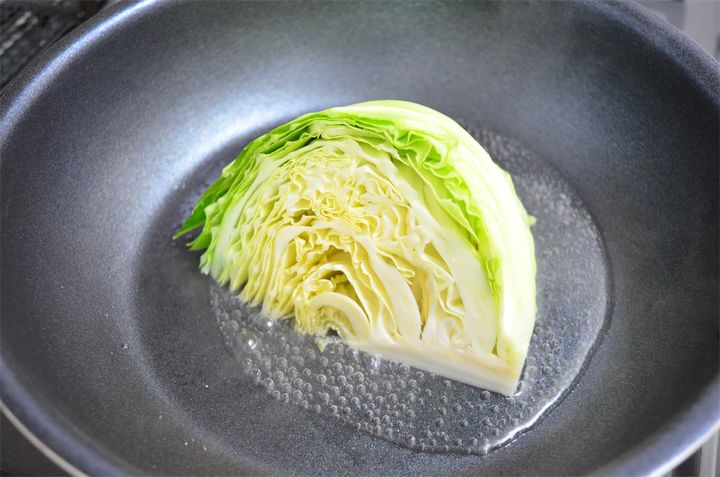 1.キャベツをくし切りにする。フライパンにオリーブオイルを引いてキャベツを入れ、中火で熱する。炒まる音がしてきたら水を加え、沸騰したらフタをして弱めの中火にする。