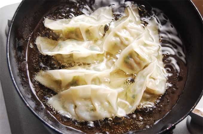 餃子を焼くときに使うフライパンに、餃子が半分浸るくらいの油を入れ、その油を一旦、別の鍋などに移して温めておきます。