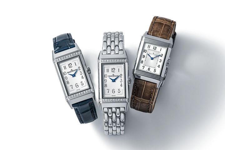 激しいポロの試合の際にも傷つかず耐えうる時計を、というリクエストから生まれた、メゾンを代表するコレクションである「レベルソ」。右_コレクションの中でも定番的なポジションの、美しい黄金比を誇る逸品。時計「レベルソ・クラシック・スモール」〈SS ケース35.78×21㎜ 手巻き〉¥1,174,800 中_クラシックよりも細長く設計された、繊細で女性らしさが際立つフォルムが特徴。ケース上下のダイヤモンドで華やぎをプラスしたブレスレットタイプなら、ドレッシーな装いにもマッチします。時計「レベル ソ・ワン」〈SS×D ケース40.1×20㎜ クォーツ〉¥1,249,600 左_同じモデルも艶やかなネイビーのレザーストラップで、グッとシックな表情に変わります。時計「レベルソ・ワン」〈SS×D×アリゲーターストラップ ケース40.1×20㎜ クォーツ〉¥1,139,600(すべてジャガー・ルクルト)