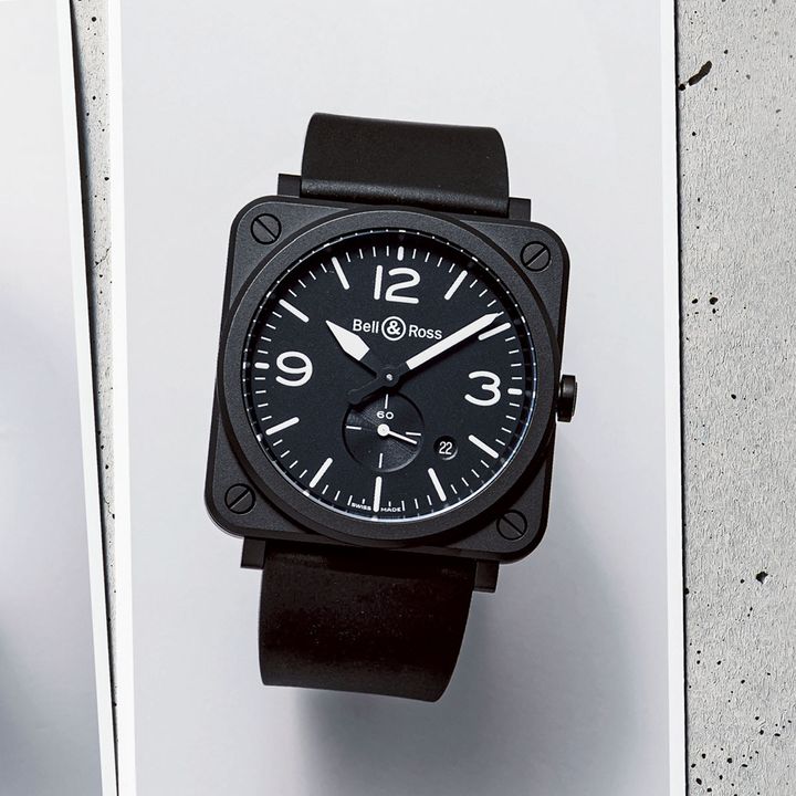 1994年フランスで誕生するや、瞬く間に時計好きの心をキャッチ。航空計器をそのまま手首に落とし込んだら…そんな発想から生まれた大胆なスクエアケースはブランドのアイコン。彼とシェアするのにもおすすめです。時計「BR S BLACK MATTE」〈マットブラックセラミック×ラバーストラップ ケース39㎜ クォーツ〉¥374,000(ベル&ロス/ベル&ロス 銀座ブティック)
