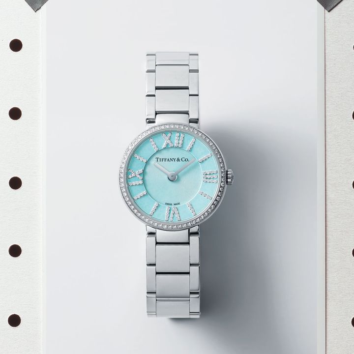 ティファニーブルーの文字盤とダイヤモンド使いが、ブランドのアイデンティティ。時計「ティファニー アトラス」〈SS×D ケース24㎜ クォーツ〉¥874,500(ティファニー/ティファニー・アンド・カンパニー・ジャパン・インク)