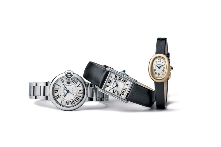 右_時計「ベニュワール」〈YG×ブラックシャイニーカーフスキン ケース24.6× 18.7㎜ クォーツ〉¥1,122,000 中_カルティエといえば長方形のレクタンギュラーウォッチを連想する人も少なくないはず。1922年に誕生した「タンク ルイ カルティエ」のデザインを踏襲しつつ、ステンレススチールで軽快に仕上げたのがこちらのモデル。ケースを縁取るダイヤモンドやサテン加工のレザーストラップでクラス感漂う手元に。時計「タンクマスト」〈SS×D×レザーストラップ ケース27×22㎜ クォーツ〉¥913,000 左_両面にふっくらと丸みをもたせた、なめらかさとボリューム感が持ち味のラウンドシェイプウォッチ。リュウズに配したブルーサファイヤをケース内部に組み込む斬新な発想はさすが。時計「バロン ブルー ドゥ カルティエ」〈SS ケース33㎜ 自動巻き〉¥935,000(すべてカルティエ/カルティエ カスタマー サービスセンター)