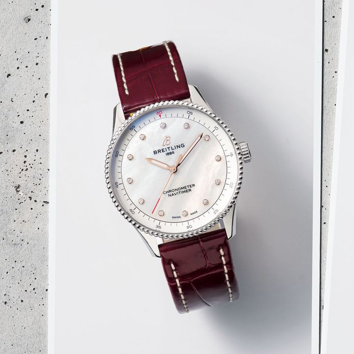 ブランド史上最も著名でアイコニックなパイロットウォッチ。マザーオブパールのダイヤルにきらめくのはラボグロウンダイヤモンド。フェミニティと華やぎを纏った機能美あふれる時計は、オフィカジスタイルを一気に格上げしてくれます。時計「ナビタイマー 32」〈SS×D×マザーオブパール×アリゲーターストラップ ケース32㎜ クォーツ〉¥528,000(ブライトリング/ブライトリング・ジャパン)
