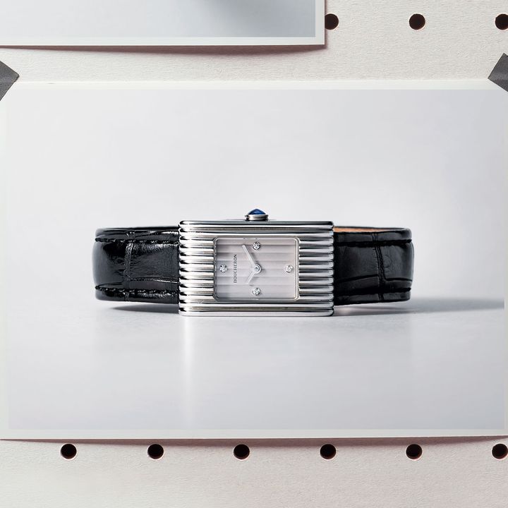 激しいポロの試合の際にも傷つかず耐えうる時計を、というリクエストから生まれた、メゾンを代表するコレクションである「レベルソ」。右_コレクションの中でも定番的なポジションの、美しい黄金比を誇る逸品。時計「レベルソ・クラシック・スモール」〈SS ケース35.78×21㎜ 手巻き〉¥1,174,800 中_クラシックよりも細長く設計された、繊細で女性らしさが際立つフォルムが特徴。ケース上下のダイヤモンドで華やぎをプラスしたブレスレットタイプなら、ドレッシーな装いにもマッチします。時計「レベル ソ・ワン」〈SS×D ケース40.1×20㎜ クォーツ〉¥1,249,600 左_同じモデルも艶やかなネイビーのレザーストラップで、グッとシックな表情に変わります。時計「レベルソ・ワン」〈SS×D×アリゲーターストラップ ケース40.1×20㎜ クォーツ〉¥1,139,600(すべてジャガー・ルクルト)