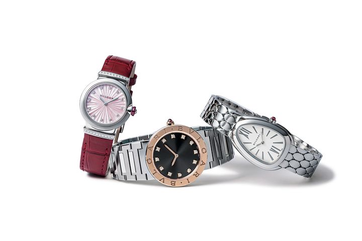 スイスの高いウォッチメイキングの技術と、ローマンハイジュエラーの美学にあふれたデザインが織りなす芸術品のようなタイムピースたち。右_時計「セルペンティ セドゥットーリ」〈SS ケース33㎜ クォーツ〉¥726,000(ブルガリ/ブルガリ ジャパン) 中_古代ローマのコインからインスパイアされたダブルロゴが目印。色褪せることのないパーフェクトなバランスで、40年以上にわたり愛され続けるコレクション。ダイヤモンドが並ぶブラックフェイスがリッチなカッコよさを約束してくれます。時計「ブルガリ・ブルガリ」〈SS×PG×D ケース33㎜ クォーツ〉¥935,000 左_エレガントでありながら気取らないデザインで、デイリーに活躍するラウンドウォッチ。時計「ルチェア インタルシオ」〈SS×D×マザーオブパール×アリゲーターストラップ ケース28㎜ クォーツ〉¥671,000(すべてブルガリ/ブルガリ ジャパン)