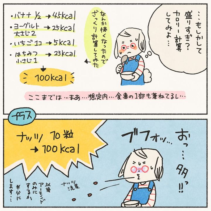 バナナヨーグルトをよく食べているというあおゐさん。カロリー計算をしてみると、ナッツが思いのほか高カロリーであることに気がつくのでした。
