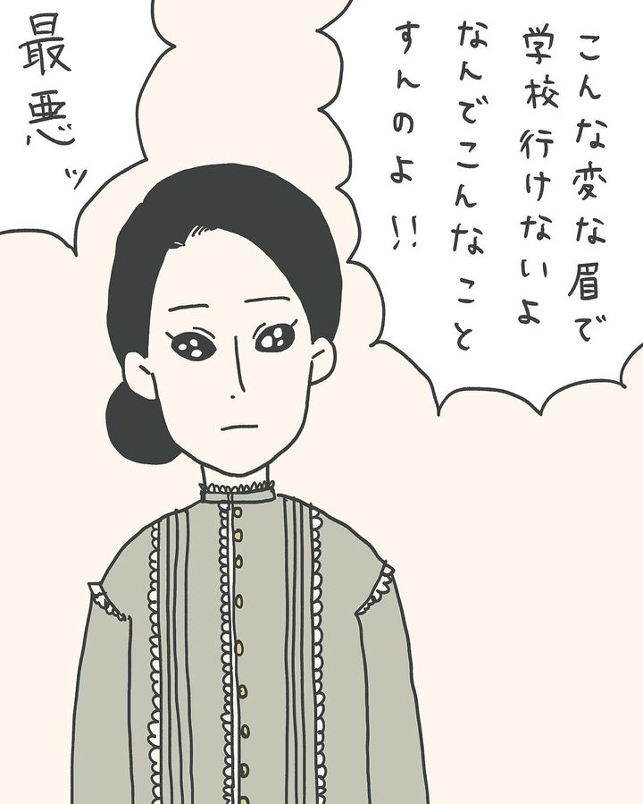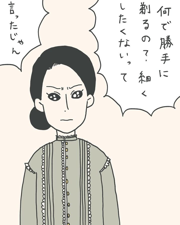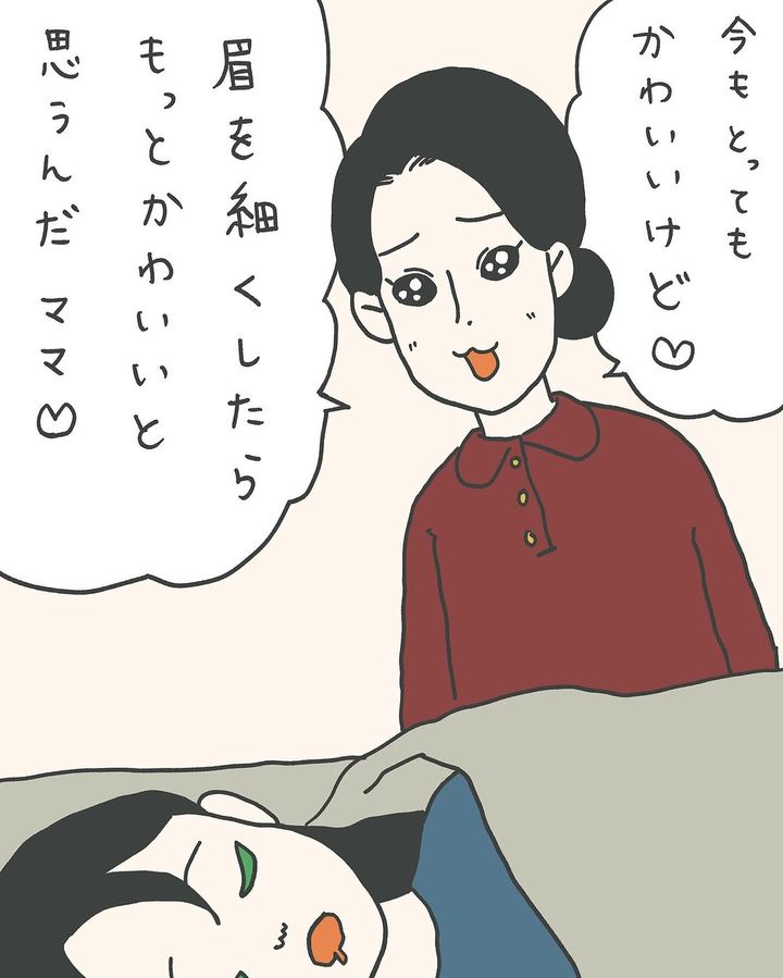 夜、寝ていると、「眉を細くしたらもっとかわいいと思うんだ ママ」と言い、母が勝手に眉毛を剃ってしまうことがあったそう。憤るうにわさびさんでしたが、母は逆上してくるのでした。