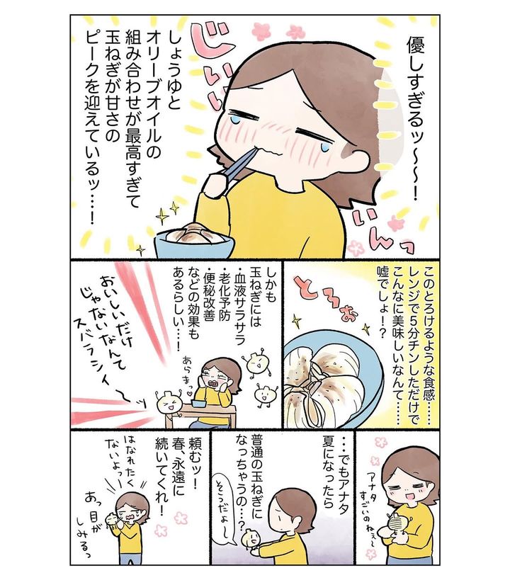 サッと調理できる手軽さもありつつ、新玉ねぎのおいしさを堪能できるのが素晴らしいですね!「優しすぎるッ~~!」と、あまりのおいしさに感涙する町田ねねこさんの姿が印象的です。