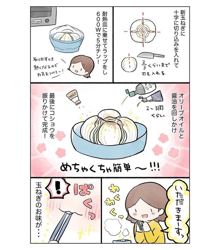 切り込みを入れた新玉ねぎを電子レンジで温め、オリーブオイル、醤油、コショウをかけて食べると、新玉ねぎの甘さが引き出され、たまらなくおいしいそうです。