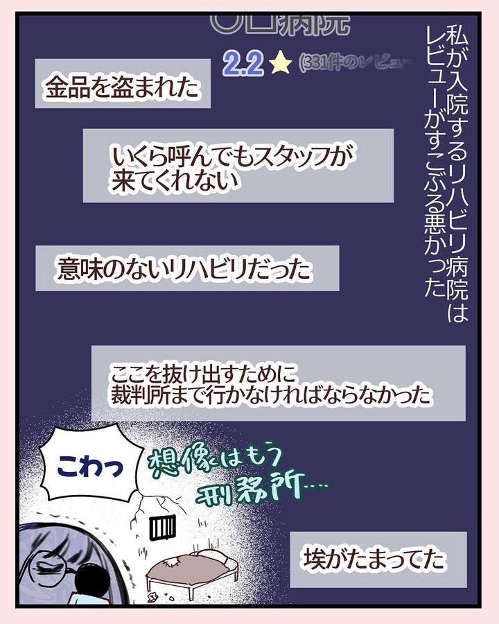 脳神経専門リハビリ病院に入院することになった夏目ひららさん。事前にチェックした口コミではかなり評価が低かったようですが、部屋は広く、食事も充実していたのでした。