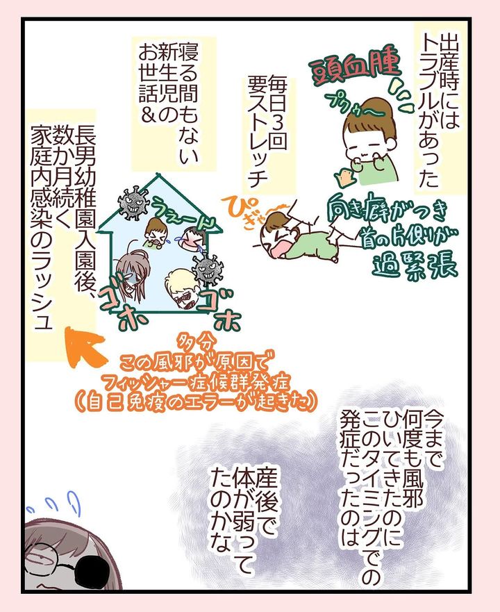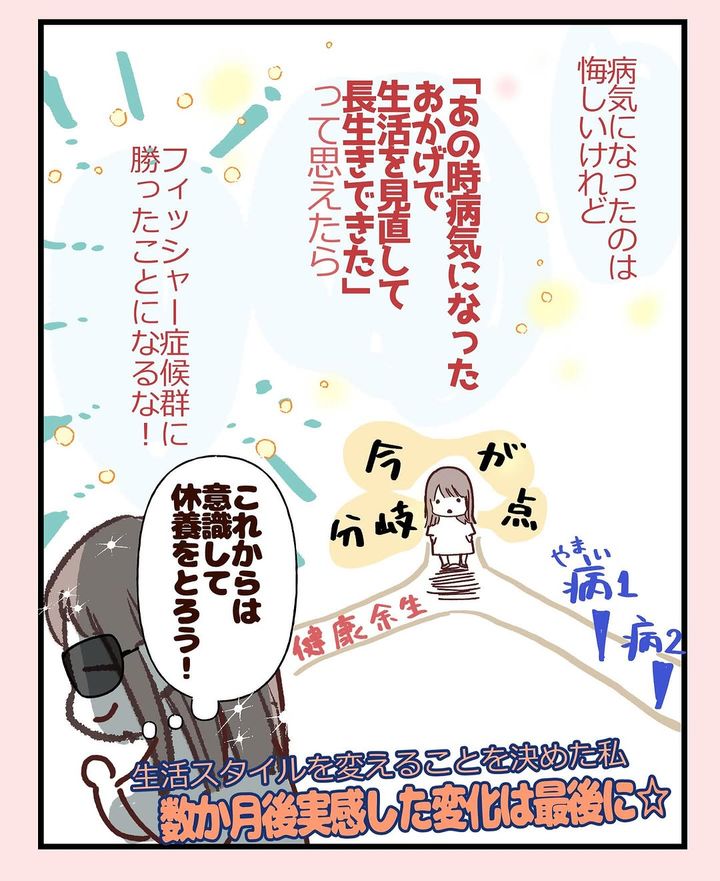 「『あの時病気になったおかげで生活を見直して長生きできた』って思えたら フィッシャー症候群に勝ったことになるな!」という前向きな言葉が、とても印象的です。無理をせず、意識的に休養を取ることの大切さに気づかされますね。