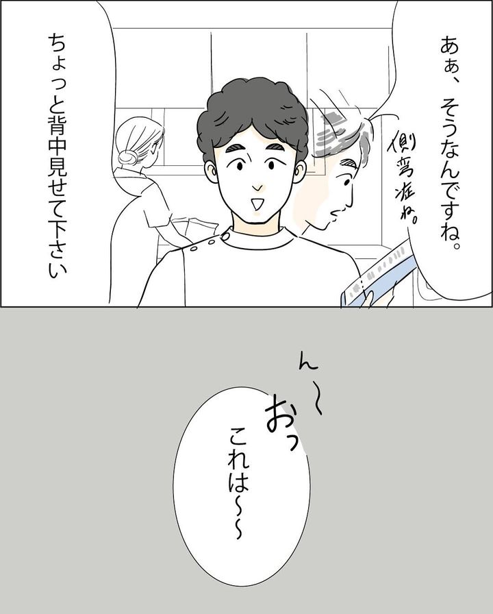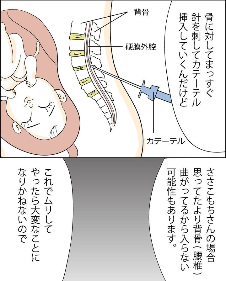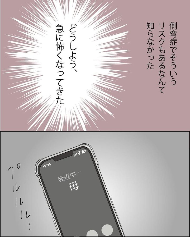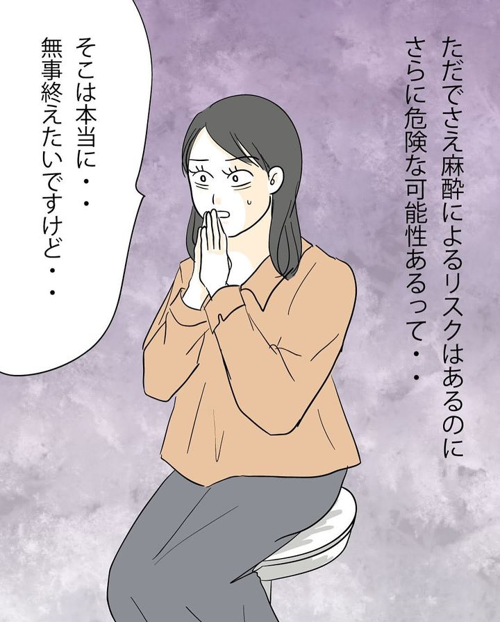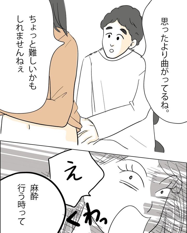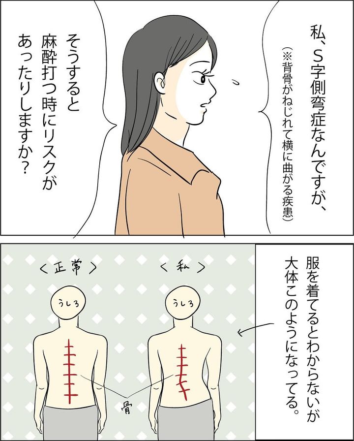 S字側弯症であることを医師に伝えたささこもちさん。すると、麻酔を行うにはリスクがあることを説明され、不安な気持ちが募っていきます。