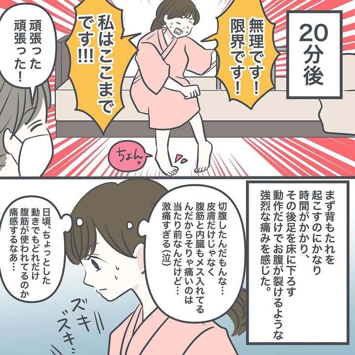 帝王切開後のリハビリが始まり、上半身を起こそうとすると、激痛に襲われます。しかし、赤ちゃんに会えると思うと、少し痛みが和らいだのでした。