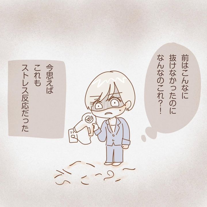 しるくさんは、「抜毛Lvは産後の抜毛に近かったです あれ?季節の変わり目?わたしまた産後抜けるの?と不思議でしたが…………これもストレスだと当時は思っていませんでした」とコメント。しるくさん自身が思っていたより、状況は悪化していたようですね。