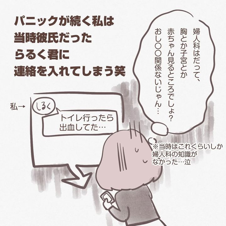 アパレル店員の仕事をしていたしるくさん。ある日、血尿が出て、らるく君に相談したところ、優しい言葉をかけられ、産婦人科を受診する勇気をもらったのでした。