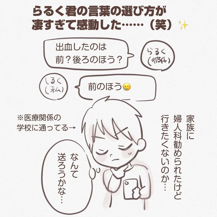 「家族に婦人科を勧められたけど行きたくないのか…なんて送ろうかな…」と、メッセージの文面を考えるらるく君が素敵です。こんな優しい言葉をかけてくれるのなら、しるくさんが結婚したいと思うのも納得です。