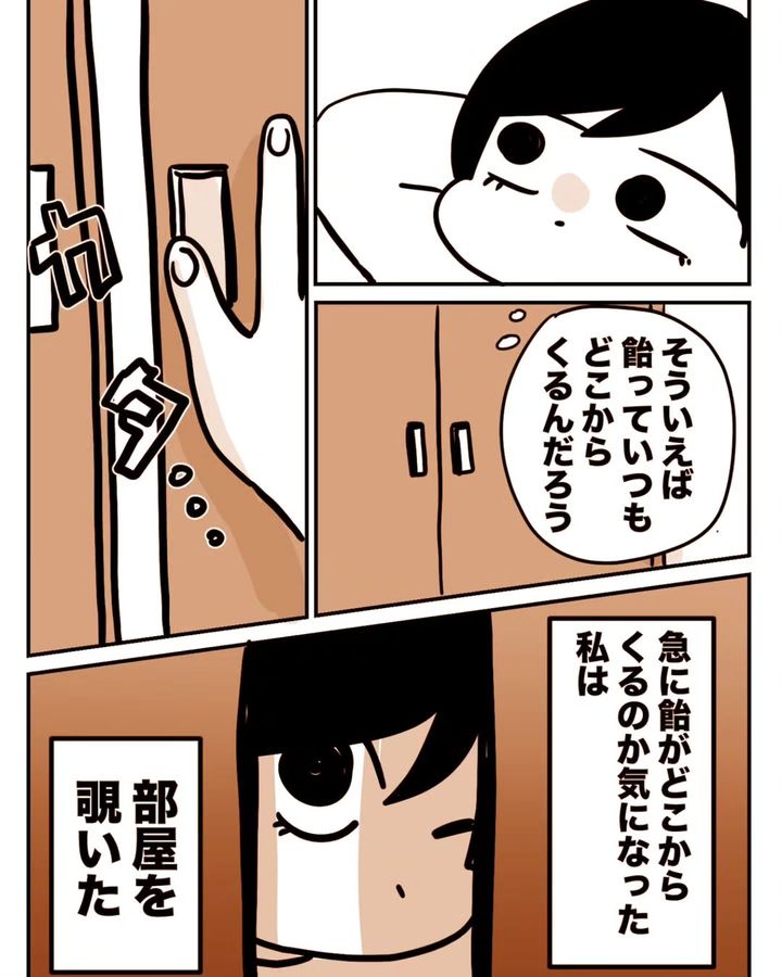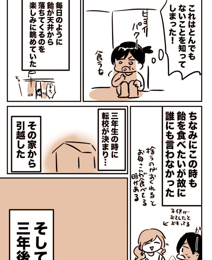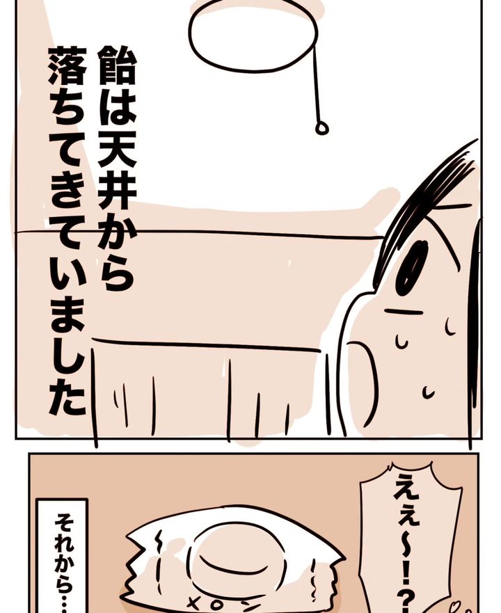 毎日のように落ちてくる飴を、ひそかな楽しみにしていた園山千尋さん。ある日、リビングの隣の部屋をこっそり覗いてみると…なんと飴は天井から落ちてきていたのでした。