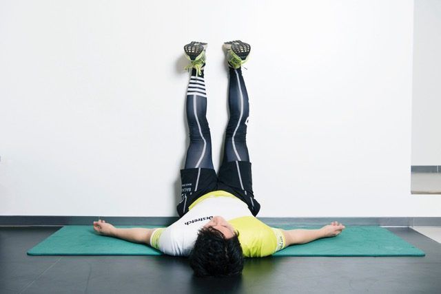 (1)お尻をめいっぱい壁に寄せ、壁にそって両脚を天井方向へ伸ばしてかかとを90度に曲げ20秒間キープする