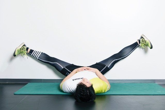 (1)お尻をめいっぱい壁に寄せ、壁にそって両脚を天井方向へ伸ばし、脚の重さを利用して自然に両脚を開いて、開ききったところで20秒間キープする
