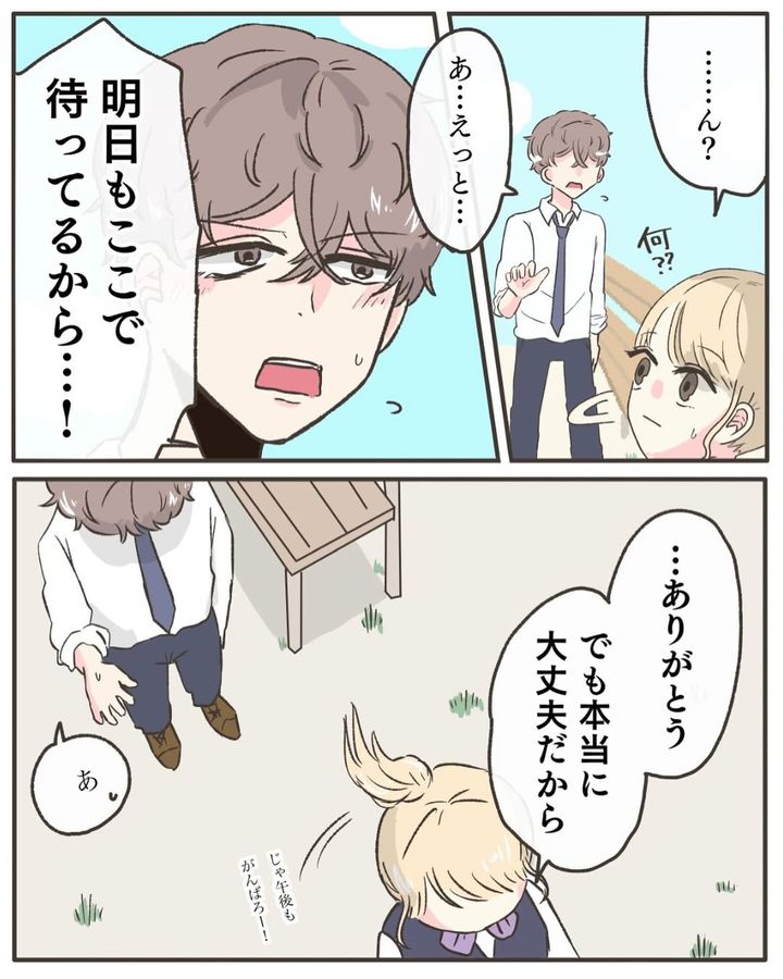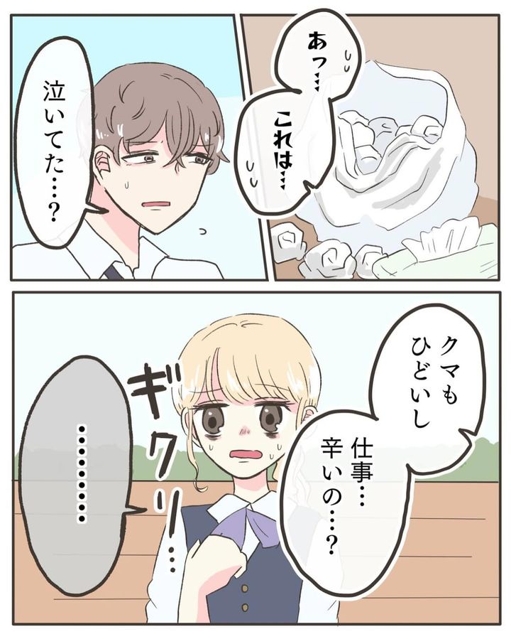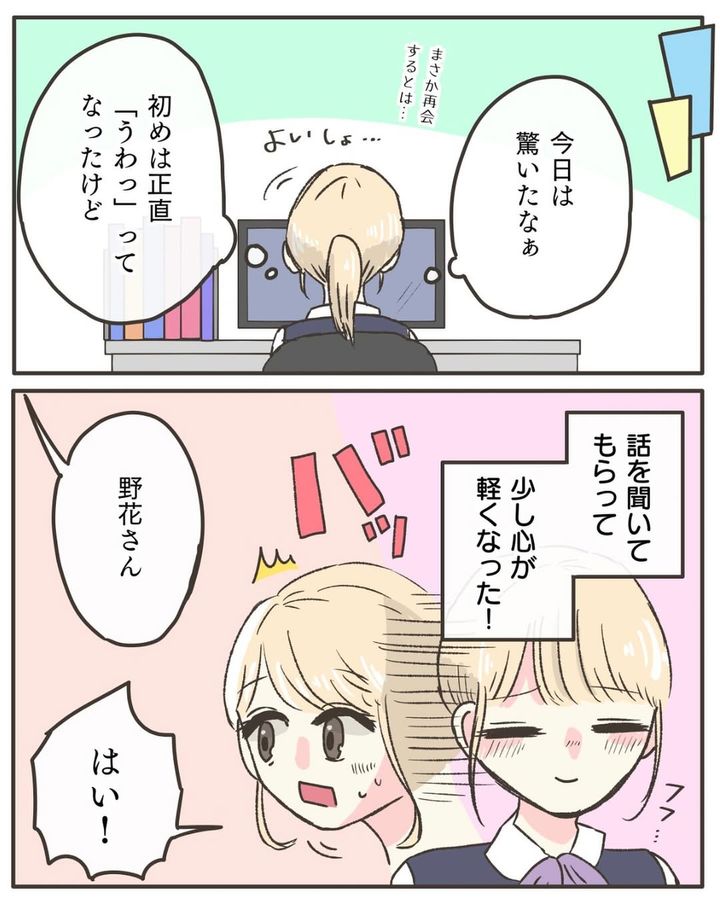 仕事の休憩中に偶然元恋人と再会した野花このんさん。仕事の辛さを打ち明けているうちに涙が溢れてしまい、元恋人から「明日もここで待ってるから…!」と励まされるのでした。