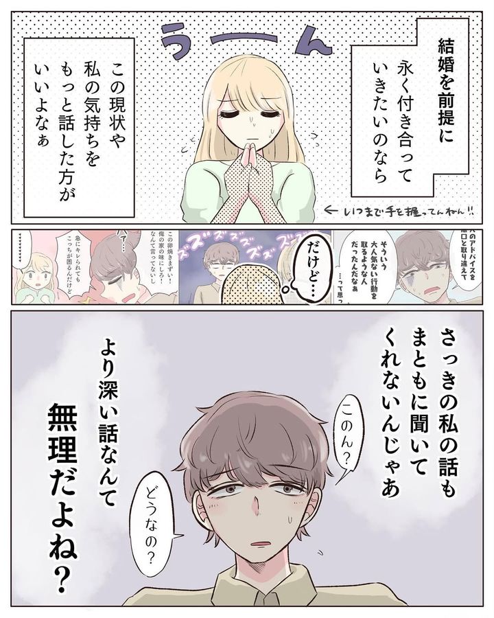 彼氏は自分の思いや考えばかりを主張していて、野花このんさんの心情を考慮していないように見えます。もし自己中心的な態度を改めないのであれば、結婚後にも問題が起こる可能性が高いですね。