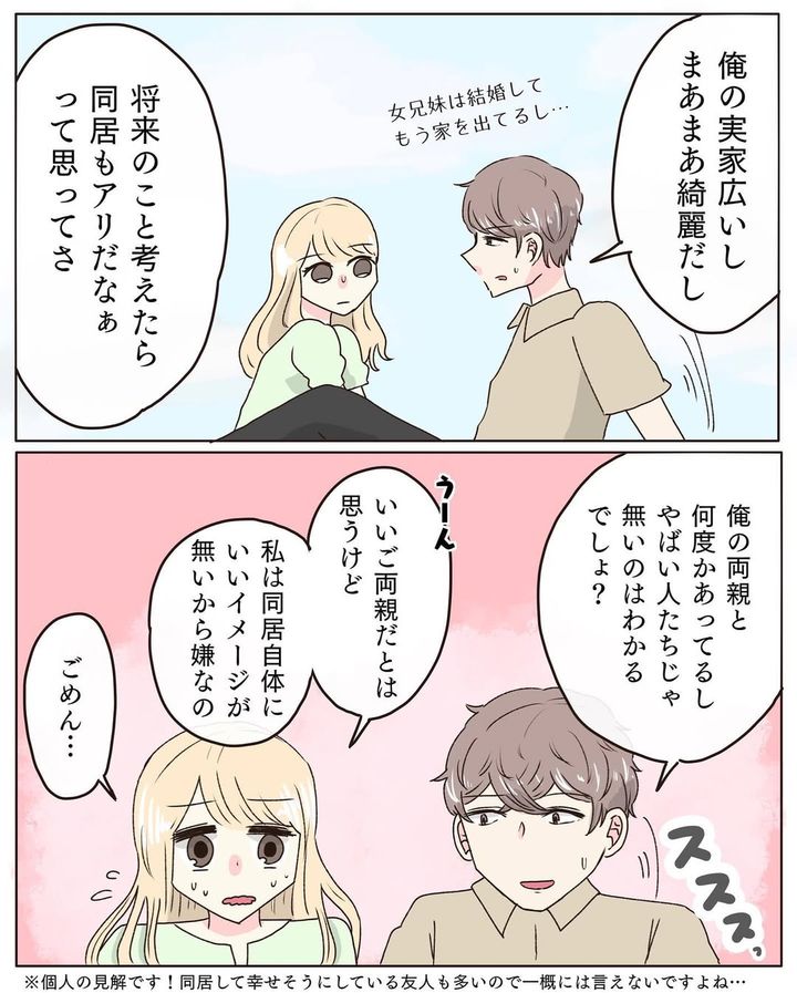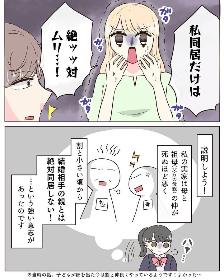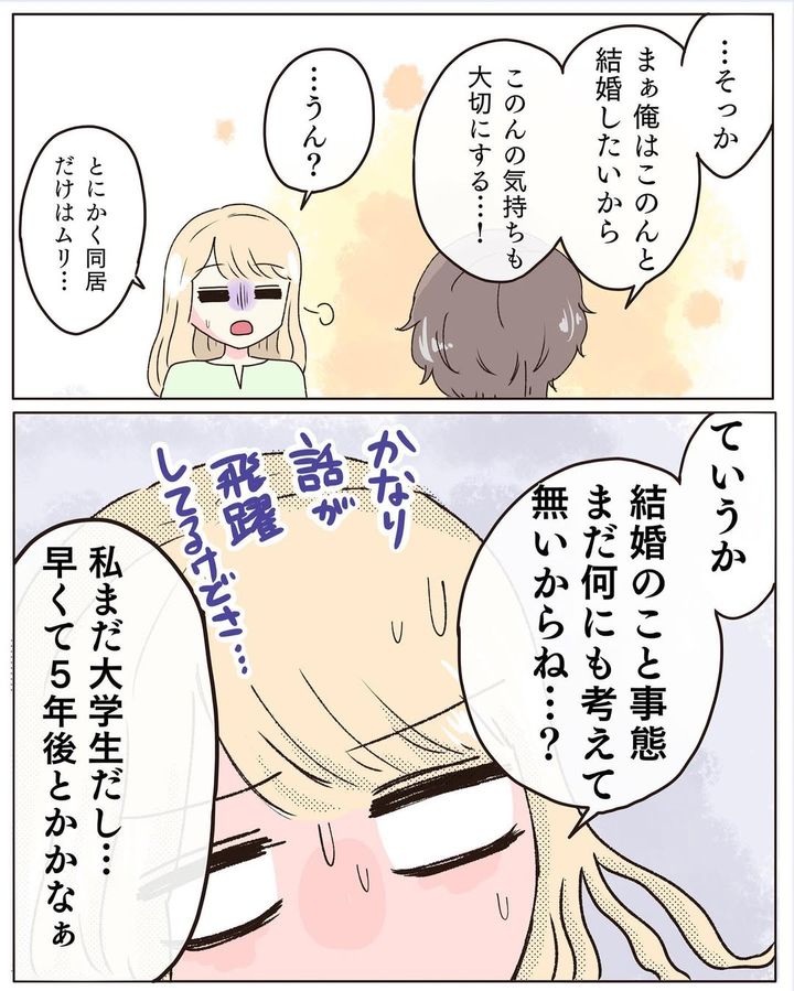大学生のころ、彼氏にプロポーズされた野花このんさん。まだ大学生で、両親との同居を提案され、「とにかく同居だけはムリ…」と必死に抵抗するのでした。