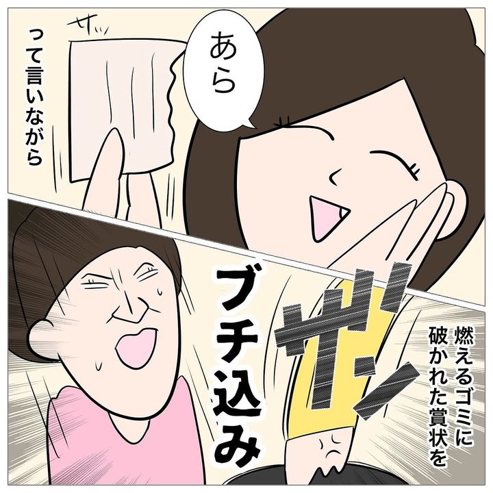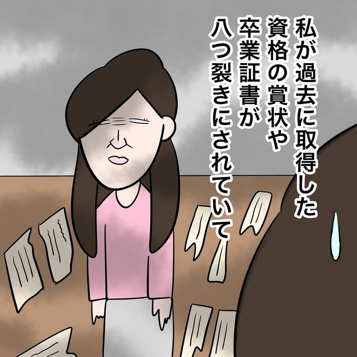 友だちと遊びに出かけていたナオコのもとに、母から電話がかかってきます。「私は家事で遊びに行けないのに!お前は金を出してもらってる立場でいいよなー」と、理不尽な怒りをぶつけられました。帰宅すると、ナオコがこれまで努力して取得した資格の賞状や卒業証書が、無残に破かれていたのでした。