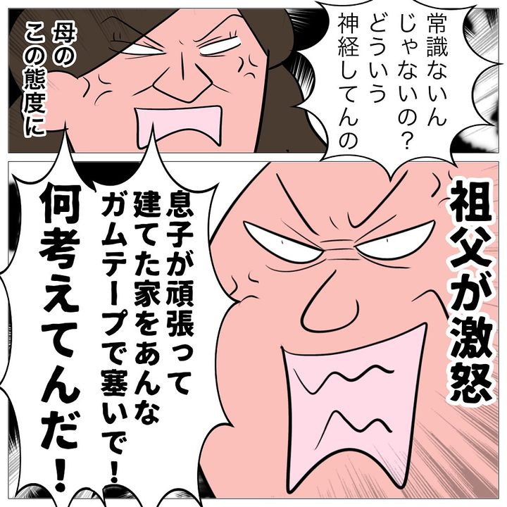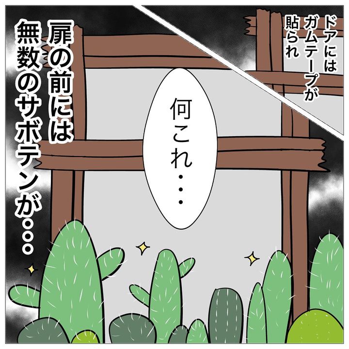祖父母と暮らす二世帯住宅に引っ越したナオコ一家。しかし、頻繁に2階に顔を出す祖父母に腹を立てた母は、なんと祖父母が入ってこられないようにと、ドアにガムテープを貼り、大量のサボテンを置いてバリケードを作るという常軌を逸した行動に出ます。