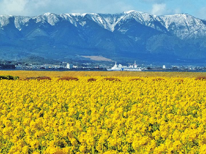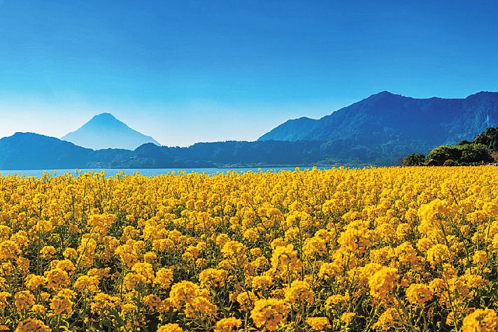 周囲15km、最大水深233mの九州最大のカルデラ湖。湖畔には菜の花やハナビシソウなどの四季折々の花々が咲き誇ります。12月中旬からは約13万5000本もの「日本一早い菜の花畑」も鑑賞できる花の名所としても知られます。