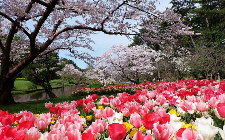 ネモフィラの花期は、4月上旬~5月中旬。約20万本のネモフィラが「みんなの原っぱ西花畑」で花のじゅうたんを広げる頃、園内中央部の渓流広場では約22万本のチューリップも見ごろを迎えます。