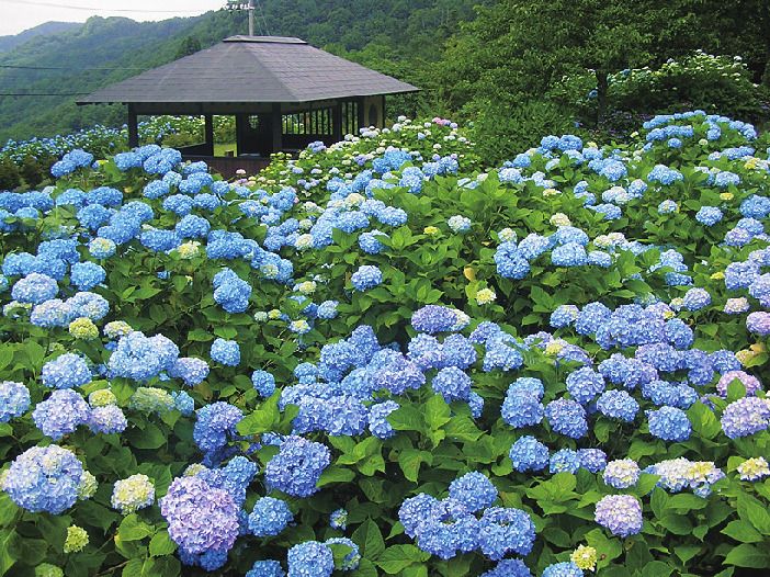 アジサイ園には約100種10万本が咲き誇り、関西有数のアジサイの名所として知られています。広大な園内の谷間を埋め尽くす鮮やかな青色のアジサイの花園は、まるで海のよう!