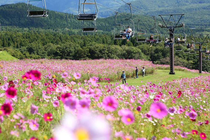 黒姫山の東側山麓に広がる黒姫高原にある「黒姫高原スノーパーク」。そのスキーゲレンデを利用して開園する「黒姫グリーンガーデン(くろひめぐりーんがーでん)」は、アクティビティや季節の味覚などが楽しめるフラワーパークです。9月中旬~10月中旬には約50種類、ひと目100万本といわれるコスモスが満開に!パノラマリフトや展望台から眺める景観は実に壮観です。