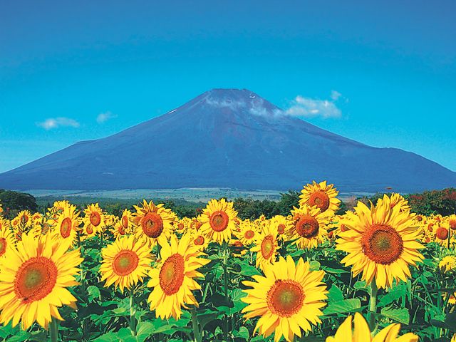 30万㎡という広大な花畑越しに富士の姿を見ることができる絶景スポット。雄大な富士山をバックに、鮮やかな黄色のひまわりが咲き誇る風景は圧巻です。