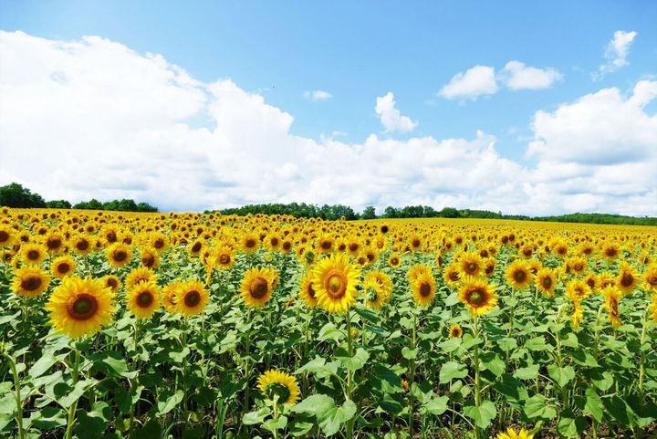 のどかな田園風景に囲まれたヒマワリ畑は、約23万㎡と東京ドーム5個分に匹敵する広さ。その畑を埋め尽くすように、およそ200万本ものヒマワリが咲き誇ります。見渡す限りの黄金色の花畑に圧倒されること間違いなし!7月下旬~8月中旬に見ごろを迎える絶景です。