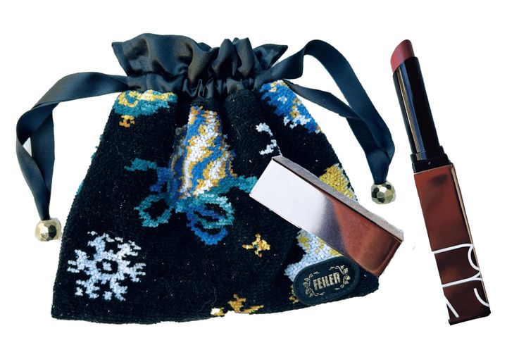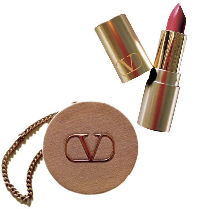「ポーチは2024年ホリデーコレクションのノベルティ♡落ち着いた色味のリップは、顔色を明るくします」(赤堀幸子さん)スパイク ヴァレンティノ100R(ともに私物)