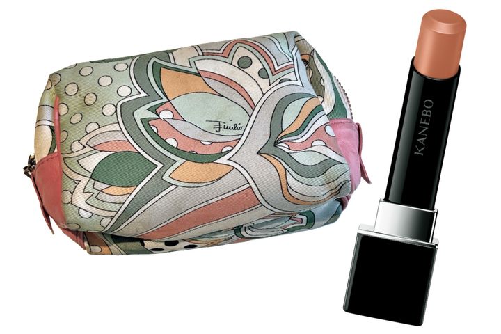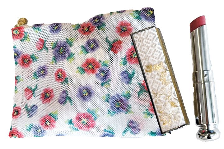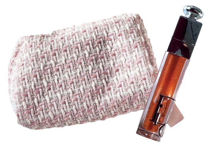 「ポーチは大容量でお気に入り。リップは塗ると軽やかな色ツヤに。オイル配合で潤いが長持ちします」(金ヶ江悦子さん)グロス リュクス04 EXQUISE(ともに私物)