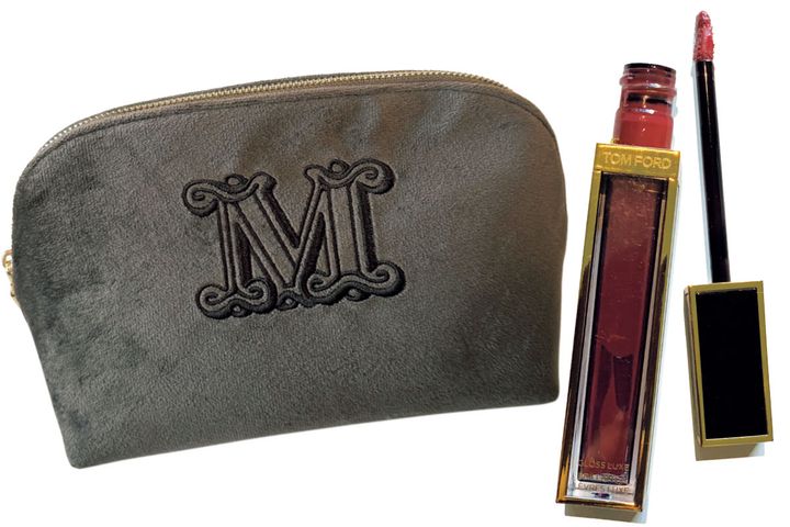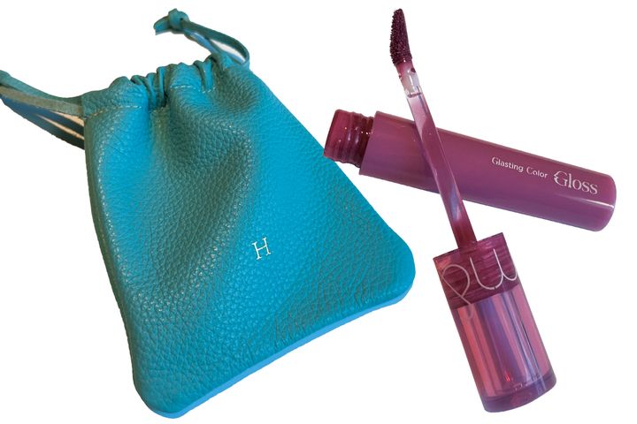 「イニシャルポーチは職人さんの手作り。リップは鮮やかな発色とガラスのようなツヤ感がお気に入り」(古川晴美さん)グラスティングカラーグロス 04(ともに私物)