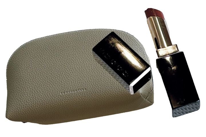 「ボリードポーチは色がかわいくて、自立するので使いやすい。リップは一目惚れしたヌーディカラー」(紙本真琴さん)モノクロームSMウェイトレスリップカラーB101(ともに私物)